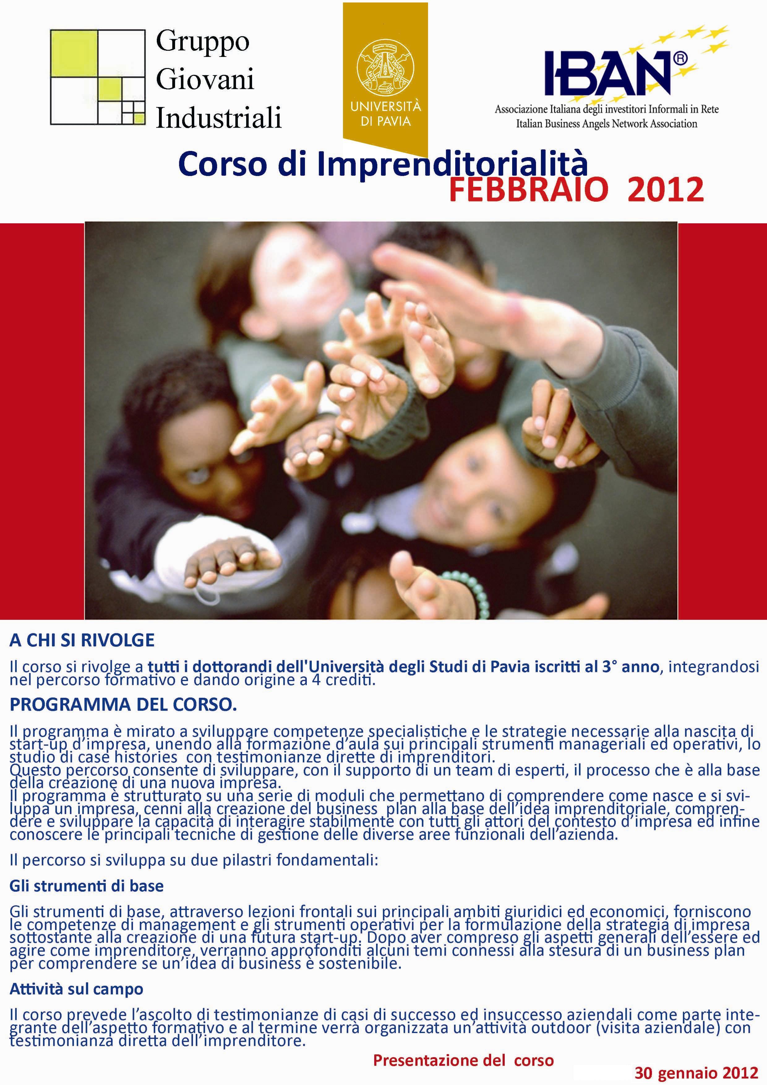 Corso di Imprenditorialità (riservato ai dottorandi del 3°anno) Pavia, febbraio 2012 Aule A-C, Campus Aquae Programma del corso