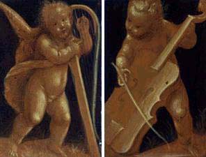 Bernardino Lanino (1512 ca-1583), attr., Angelo che suona l’arpa e Angelo che suona la viola da gamba (1560-1570), tempera a monocromo su tavola, cm 34,5x23. Vercelli, Museo Francesco Borgogna, inv. 1906, V 346-347, cat. 1969, no. 53/1-2.